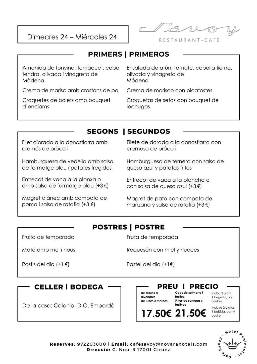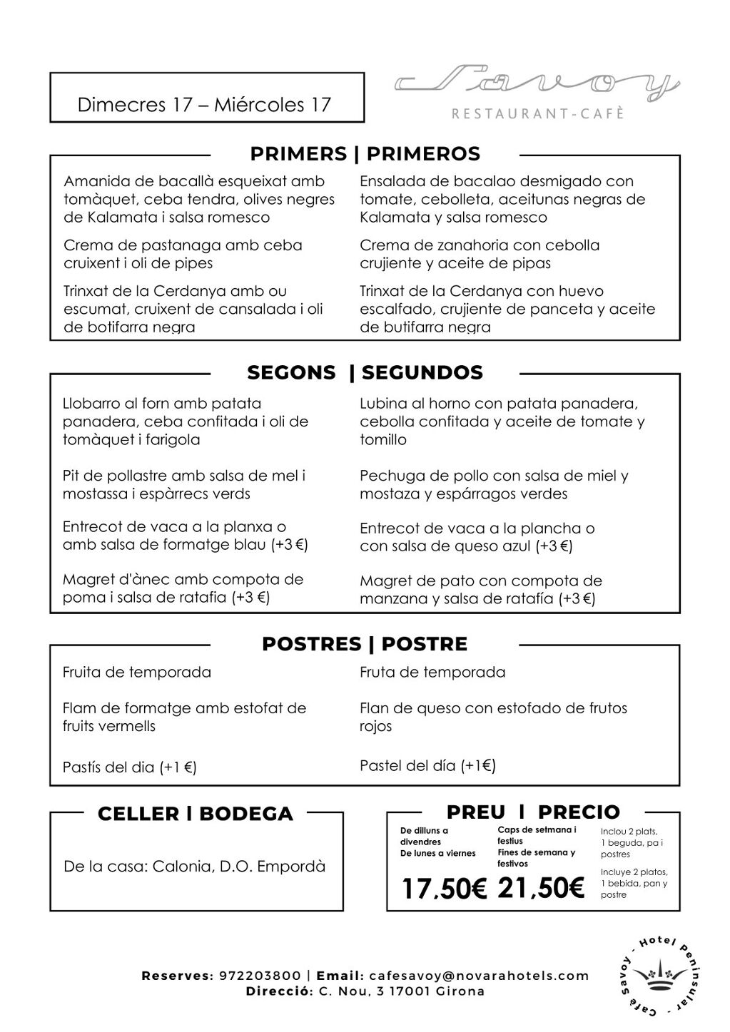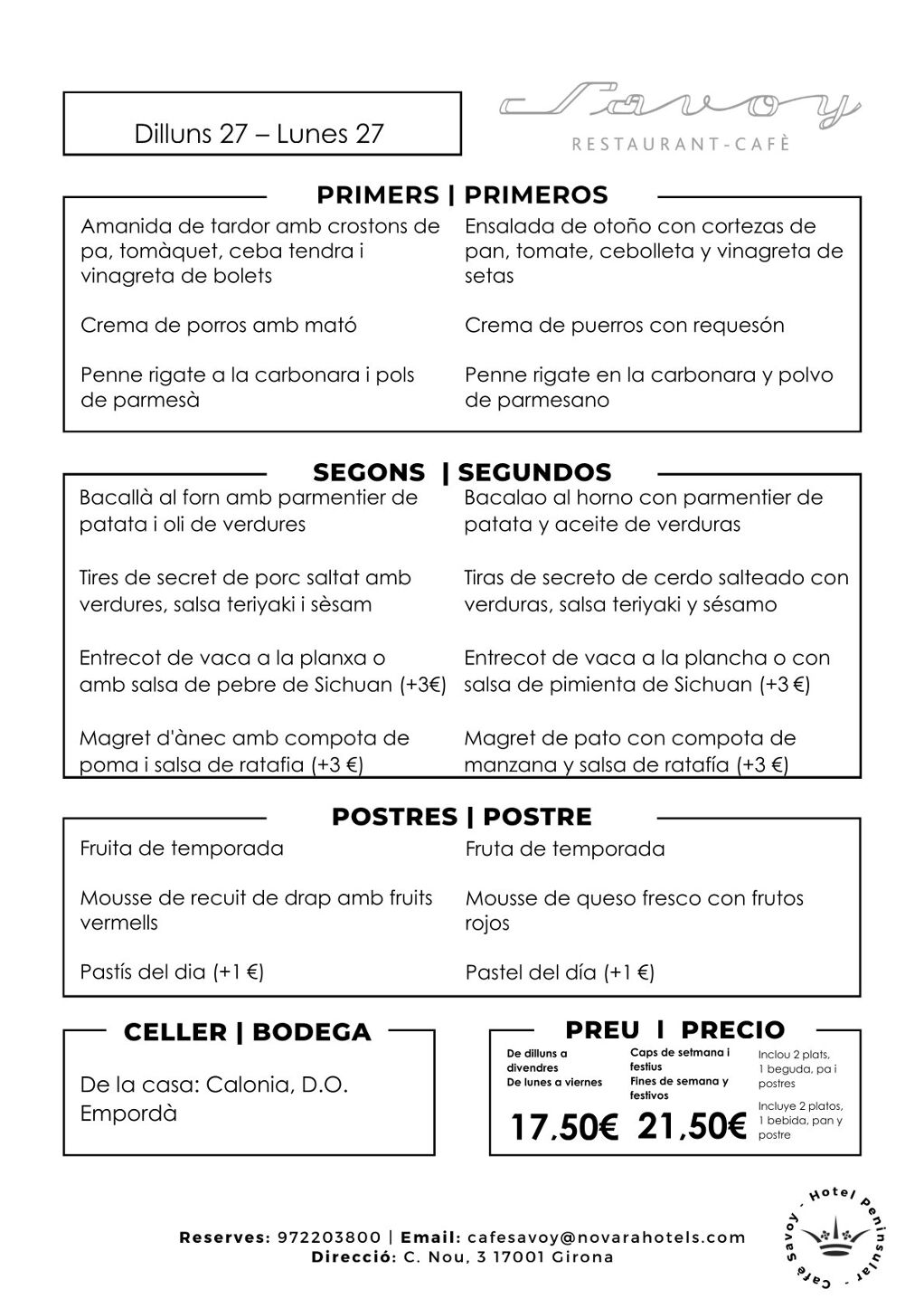A la recerca d'oferir la millor qualitat per als nostres clients, al restaurant Savoy elaborem un menú diari sa i equilibrat que trobarà disponible tots els migdies.