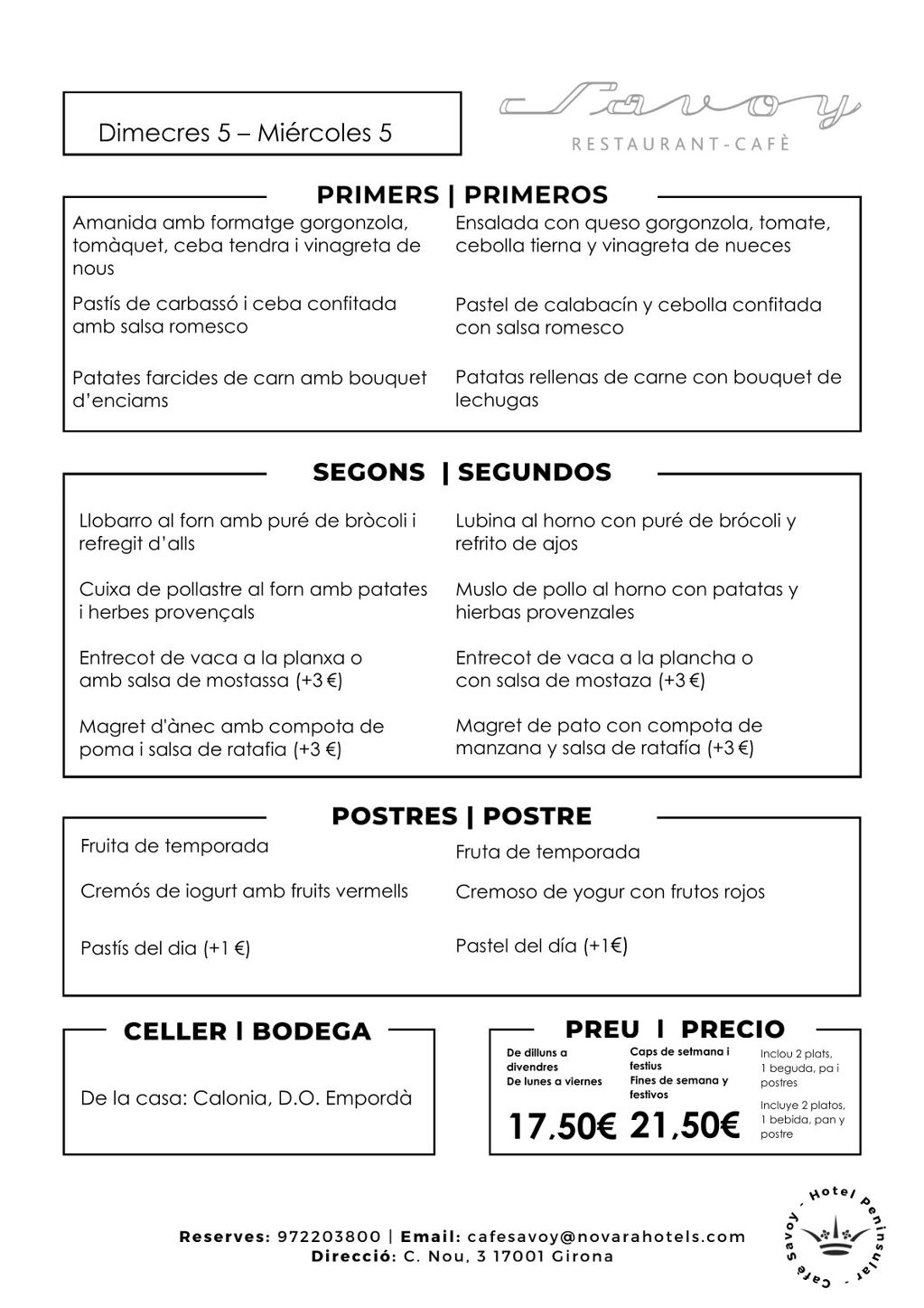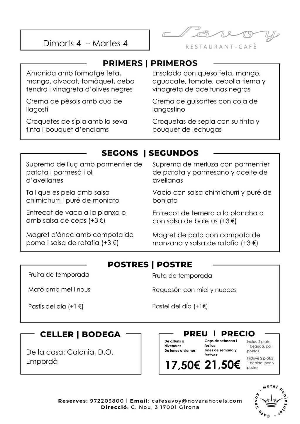 En busca de ofrecer la mejor calidad para nuestros clientes, en el restaurante Savoy elaboramos un menú diario sano y equilibrado que encontrará disponible todos los mediodías.
